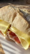 High angle close-up shot of a ham and cheese sandwich served at sidewalk cafe