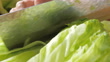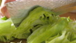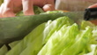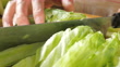 Hand cut iceberg lettuce on wooden chopping board - 4K stock video