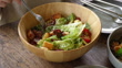 Hand holding fork eating Caesar salad with romaine lettuce and croutons in wooden bowl, healthy lifestyle diet concept - 4K stock video