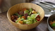 Caesar salad being eaten with fork from wooden bowl, featuring fresh greens, cheese, and croutons. Concept of healthy food, clean eating, balanced diet, and wellness lifestyle.
