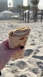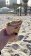 Hand holding meat wrap enjoying picnic lunch on beach - 4K stock video
