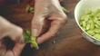 An adult woman prepares food in the kitchen, peeling fresh soybean pods with her hands and putting them in a bowl