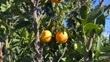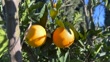 Orange, grapefruit, lemon, cumquat or mandarin tree with fruit on a sunny day. Ripe fresh fruits hanging from branches in an organic orchard. Citrus farming, import-export trade, nature and food background in 4k resolution.