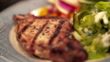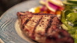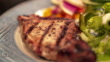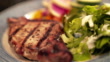 Handheld Moving Slow Motion Close-Up shot of Ready to Eat Cooked, Boneless, Seasoned, Juicy Tenderloin Pork Chops on a Plate with Green Salad and Vegetables