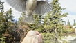 Handheld shot of Grey jay perching man's hand against trees at forest - HD stock video