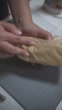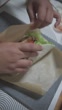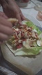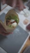 Hands carefully roll a tortilla wrap filled with sliced eggs, crispy chicken, fresh lettuce, and sauce, tightly wrapping it in brown parchment paper for serving. - 4K stock video
