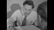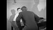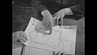 CU hands of Rainer Hildebrandt, KgU anti-communist group, and another man pointing at details of architectural floor plan of building / Hildebrandt writing something down / same two men talking / CU other man unrolling architectural floor plan and showing it to Hildebrandt / two shots of same two men talking / CU Hildebrandt's hands as he unfolds map of communist prison camp, both men point at details on map / view from behind man as he walks up and sits at desk where Hildebrandt is sitting, they shake hands / man pulls message out of teletype machine, he walks away / Hildebrandt and man he has been conferring with standing and talking, man leaves through curtain, Hildebrandt leaves through door / two men outside at night painting large letter on wall / Hildebrandt and another man in room talking and standing up, they shake hands / Hildebrandt and other man sitting at desk talking as Hildebrandt writes something down / CU hands of other man pointing at details on architectural floor plan of building, they shake hands / Hildebrandt shaking hands with another man / Note: exact day not known