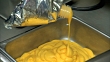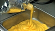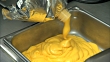SLO MO CU Hands of unidentifiable female worker squeezing liquid cheese sauce out of silver pouch & into metal basin. Nachos, snack, food, service, vendor, preparation, unhealthy, obesity, junk, refreshments.