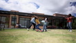 Happy black couple playing catch the ball with their three kids at their back yard while grandparents relax at background - Lifestyles