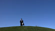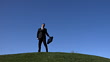 Businessman running, jumping and celebrating on a grassy hill (slow motion)