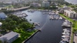 Aerial view of a small town harbor.