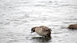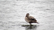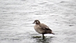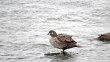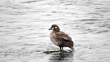 A female harlequin duck stand on a rock in the river. this duck is a little young when it grow up it become very cute especially the color with tattoo in male.