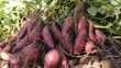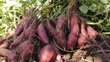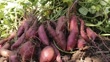 Harvest fresh sweet potatoes purple close-up in the garden in autumn selective focus