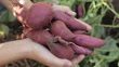 Harvest fresh sweet potatoes purple close-up in the garden in autumn selective focus