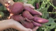 Harvest fresh sweet potatoes purple close-up in the garden in autumn - HD stock video