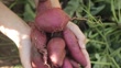 Harvest fresh sweet potatoes purple close-up in the garden in autumn selective focus