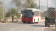 Hatta, Dubai. Pan-left from a man watering the trees on the side of a road from his water truck to a bus moving on the other side of the road.