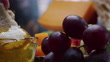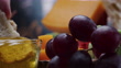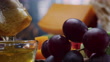 Having bread and cheese with honey and fruit. Dipping bread into honey. Close-up front view - 4K stock video