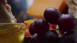 Having bread and cheese with honey and fruit. Dipping bread into honey. Close-up front view