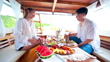 Sweet couple lover in boat touring are enjoy moment with meals lunch celebration together on boat floating at middle of the sea in summer season