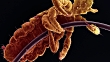 "Head louse. Animated coloured scanning electron micrograph (SEM) of a head louse (Pediculus humanus capitis) clinging to a strand of human hair. The head louse is one of three lice species that feed exclusively on humans. It ranges in size from 2 to 3 millimetres in length. Each of its six legs ends in a claw. These claws are used to grasp the shaft of a hair, and as such render the louse unable to jump. An infestation will cause itching due to an allergic reaction against louse saliva, and if not treated can lead to fever and secondary infections."