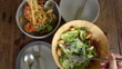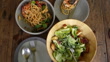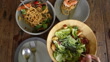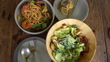 Healthy Caesar salad and spaghetti pasta served together on rustic wooden table, wellness lifestyle food background - 4K stock video