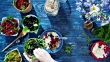 Healthy summer breakfast with fresh berries, farmer's cheese and oatmeal on the blue wooden table. Human hands making a portion of the meal. Overhead view. Fast motion