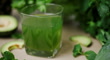 Footage dolly shot, Fresh fruits, vegetables and juice are arranged together. A green juice glass is surrounded by ingredients such as avocado, pineapple, mint leaves and greens.