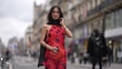 PARIS, FRANCE - MARCH 3: (SLOW-MO) Heart Evangelista wears sunglasses, bracelets, a black scarf, a red floral backless dress, blue denim pants, a red bag and black wedges outside Akris during the Womenswear Fall/Winter 2024/2025 as part of Paris Fashion Week on March 3, 2024 in Paris, France. (Footage by Edward Berthelot/Getty Images)