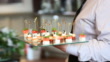 Unrecognisable waiter holding a glass platter of small salmon based canapés.