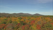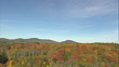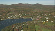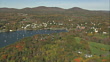 AERIAL Heavily wooded hills in fall colors, homes nestled in trees, and sailboats at anchor in distant harbor with town beyond / Rockport, Maine, United States - HD stock video