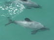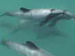 Hectors dolphin pod MCU just under waters surface, break to breathe then split and leave frame. - stock video