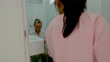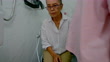 Woman old grandmother in motion of illness of pain of stomachache, food poison or diarrhea, period of woman in toilet need support help in hand by younger kid grandchild