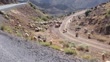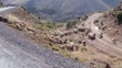 Herd of sheep walking along a curved dirt road in an arid mountain landscape, blending with the rustic rural scenery on a sunny day. - 4K stock video