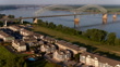 City connection between Tennessee and Arkansas state. Hernando de Soto bridge extend above Harbor Town on the Mississippi River in Memphis, TN. 4k UHD b-roll video footage
