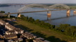 Hernando de Soto bridge connects West Memphis, Arkansas and Tennessee. Harbor town stretching along the Mississippi river in Memphis, TN. Aerial footage with forward camera motion to swimming pool - 4K stock video
