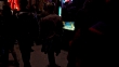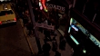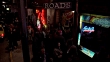 HIGH ANGLE DOWN FROM ABOVE CITY STREET LOOKING DOWN ON TO ENTRANCE OF ROADS BAR OR NIGHTCLUB. PEDESTRIANS WALKING ON SIDEWALK IN FRONT OF BAR. POV MOVES DOWN TO STREET LEVEL. SEE STREET SIGN JACK KEROUAC. POV FOLLOWS PEDESTRIANS UP TO ENTRANCE OF BAR.