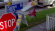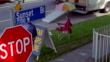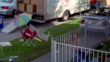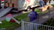 HIGH ANGLE DOWN OF SALEEN S281 SILVER FORD MUSTANG CONVERTIBLE DRIVING INTO STREET CORNER SIDEWALK OF SUNSET BLVD AND OGDEN DRIVE. VENDOR WITH "STAR MAPS HERE" SIGN JUMPS OVER METAL FENCE OF HOUSE. MOVERS CARRY CARDBOARD BOXES FROM U-HAUL TRUCK. SUNSET BLVD STREET SIGN AND STOP SIGN VISIBLE. STUNT. WEST HOLLYWOOD.