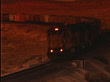 High angle PAN freight train rounding curve towards camera in desert at sunset / filter - stock video