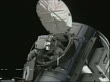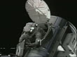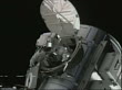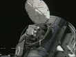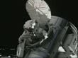 High angle medium shot astronaut climbing out of a hatch on the International Space Station