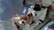High angle medium shot zoom in technician using microtome to slice tissue / placing samples in glass pan for staining - HD stock video