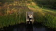 Slightly elevated front view of smiling woman in early 20s sitting at end of pier with English Cocker Spaniel and then drone zooming away over pond.