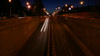 A frenetic traffic of white and red lights running in and out of a tunnel.