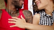 A young couple- black man with white woman in love, chatting and smiling, lying on the towel- an American flag