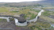 Drone footage rotating around the twin waterfalls of Hjalparfoss. Filmed in Iceland