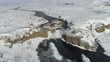 Drone footage moving towards the twin waterfalls of Hjalparfoss in winter snow. Filmed in Iceland
