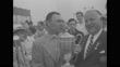 Title: "Hogan Golf Champ - 'Mr. Comeback' Does It Again!" superimposed over crowd walking / CU Ben Hogan, golf champion, getting ready to tee off during US Open play at the Oakland Hills Country Club in Bloomfield Hills, MI / CU Hogan / MS Hogan teeing off / Back view of gallery waking / WS crowd walking / MS player out of trap, ball hits hill and then starts to roll downhill / MS Hogan putting, follow ball misses cup / crowd watching / golfer Jimmy Demaret putting, ball hits cup and bounces away / MS Bobby Locke, British Open champion from South Africa, sinks a putt / 18th hole / WS golf course / VS Hogan getting ready to putt / crowd / Hogan getting ready to putt and hits ball and ball drops into hole at right of crouched man, crowd cheers as Hogan walks off / Hogan posing with caddy / CU Hogan gets trophy / CU Hogan holding trophy posing with man