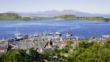 Holidays in Scotland - scenic view of Oban on the west coast of Scotland with the town, ferry terminals and hills in the background