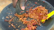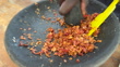 A home cook uses a mortar and pestle to grind peanuts and chilli into a satay sauce for use in traditional Indonesian cooking. Close up, real-time.