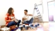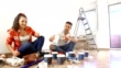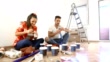 Closeup side angle view of mid 20's couple redecorating their new apartment. They are sitting on the floor and mixing some paints until they reach the desired shade.